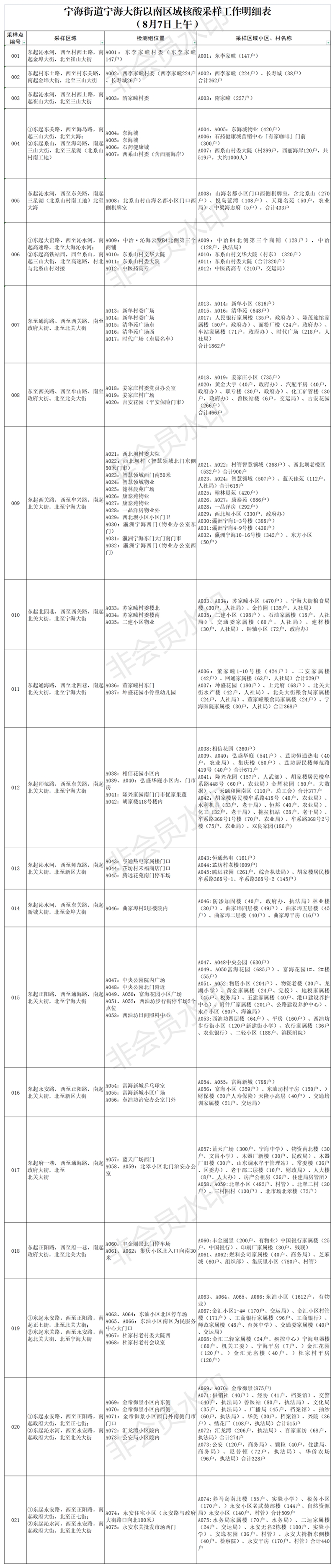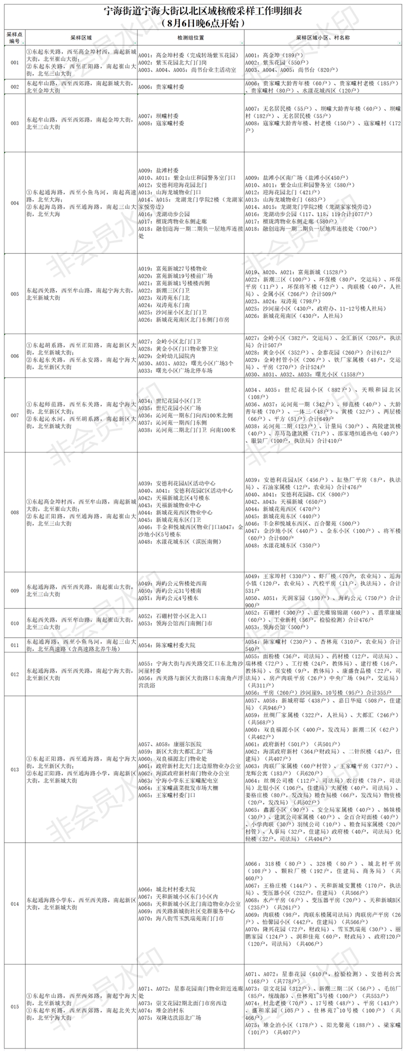 广大市民朋友: 宁海街道将启动第二轮核酸检测,以宁海大街为界分成两个区域,8月6日下午6点开始检测宁海大街以北区域(不包括东系山、西系山、北系山、东李家疃、西李家疃、隋家疃、