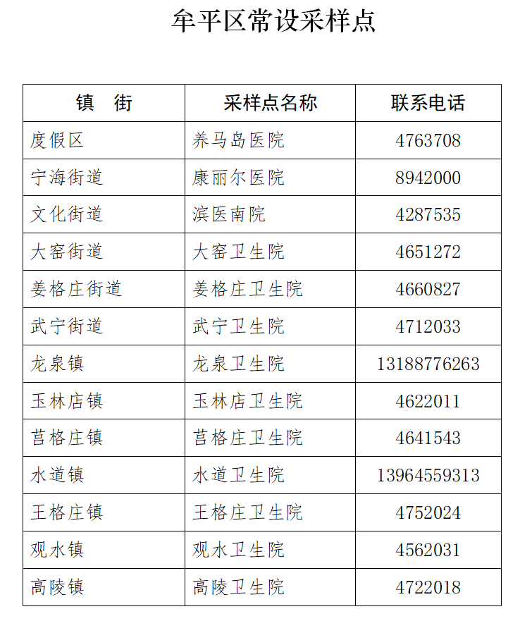 关于建立常设采样点的通告广大居民朋友:8月4日至8月7日,牟平区已基本完成两轮全员核酸检测。您可能因为各种原因未参加一轮和二轮检测,为方便广大居民朋友进行补测,我区将在每个镇街设立1个常设核酸采样点,