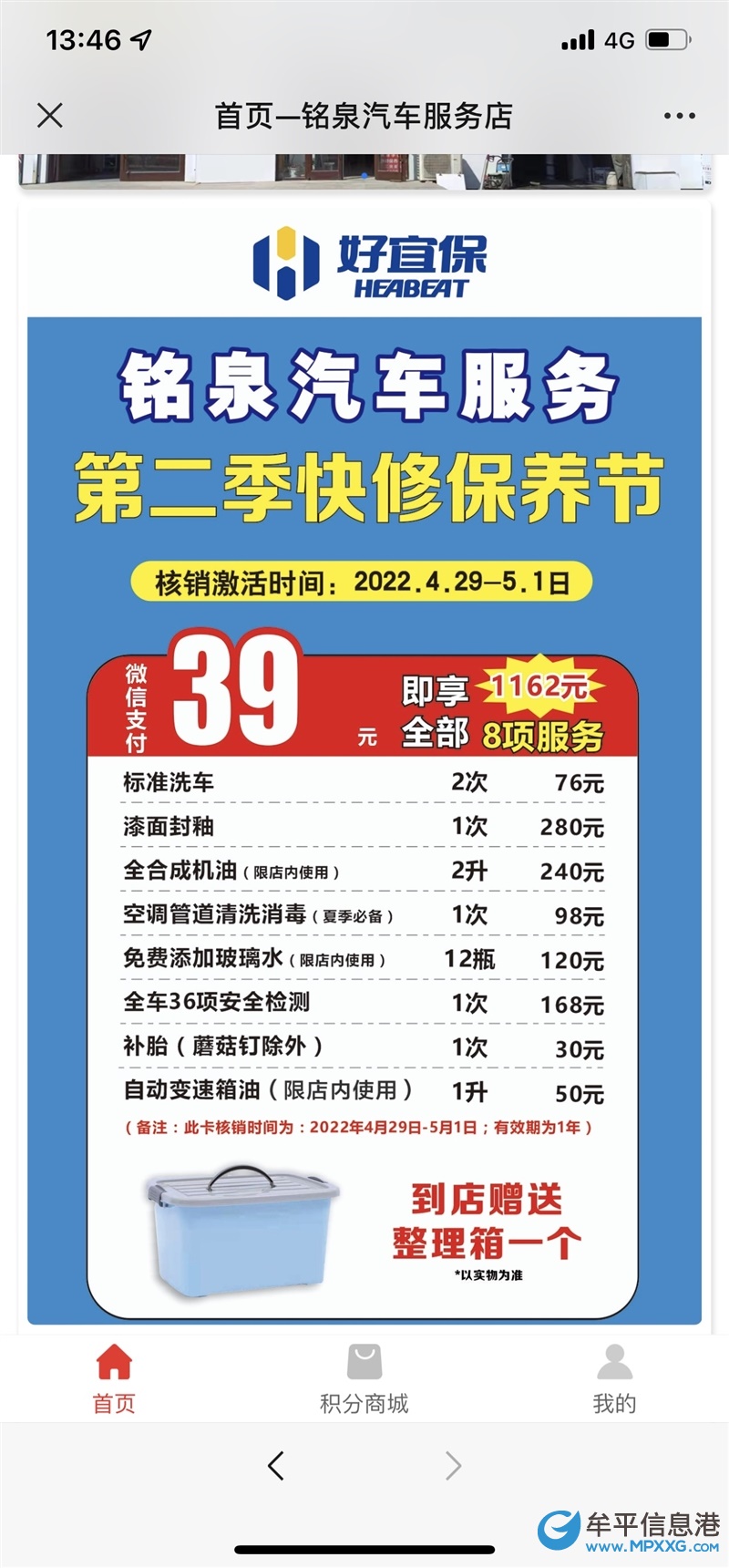 39元套餐卡里面包含两次原价38元的洗车,漆面封釉,玻璃水12瓶,全合成机油两升…………到店激活送车载收纳箱一个!!!!详情可以打电话咨询。
