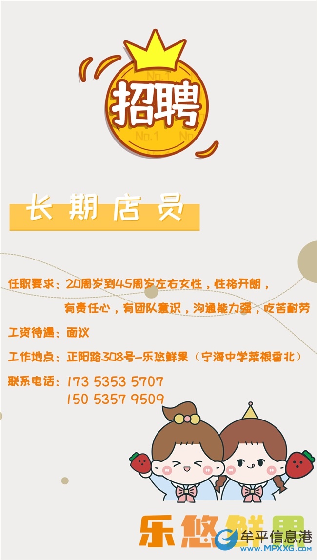 工作地点:正阳路308号-乐悠鲜果(宁海中学菜根香北)