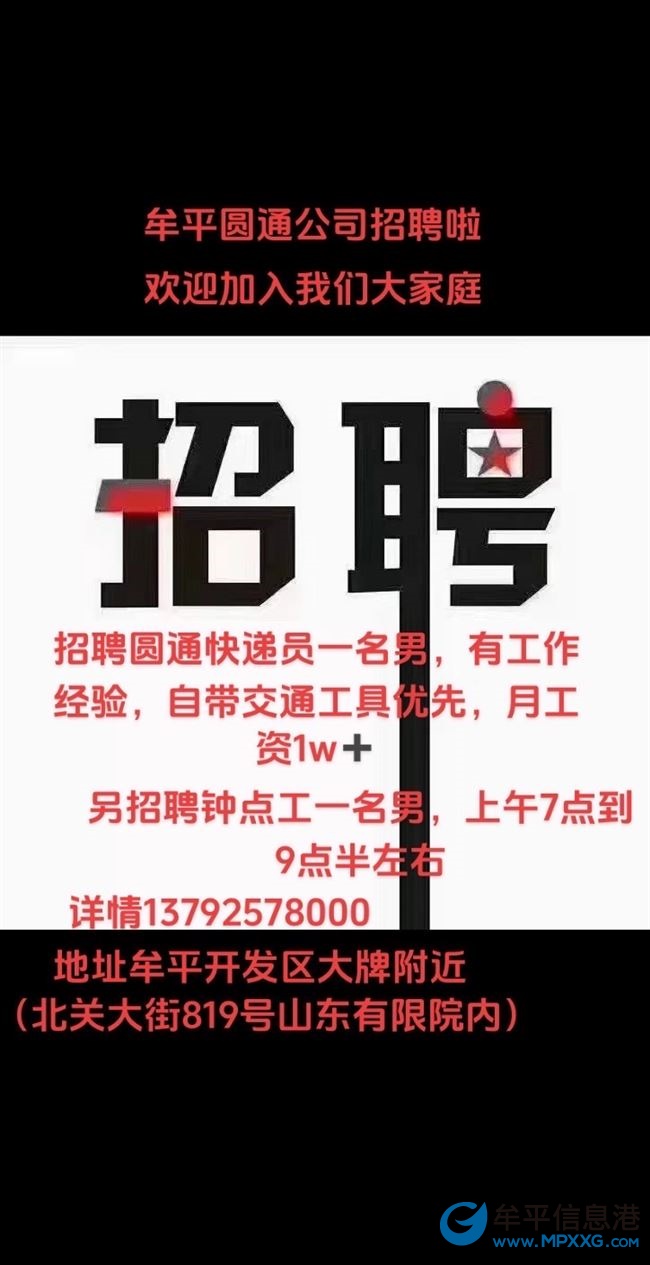 牟平圆通快递招聘,快递业务员一名,要求男,能自备交通工具者,有工作经验优先,主要是送快递(牟平振华片区),月工资大约在10000上下,只要肯付出,工资不是问题