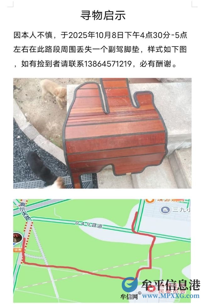 失主寻物:2025年10月8日下午5点左右在西埠庄村道附近丢失了一个副驾脚垫,有捡到的朋友请联系 必有酬谢